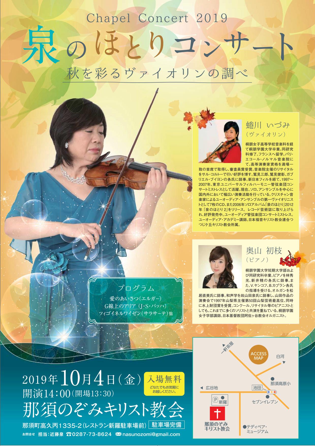 チャペルコンサート 2019 2019年10月4日(金) 那須のぞみキリスト教会 那須町高久丙1335-2(レストラン新羅駐車場内) 開演14:00 By Tomio Ohashi | 2019/07/30 | What's NEW, イベント情報 | ← 香港フェスタ2019 三浦綾子読書会 →